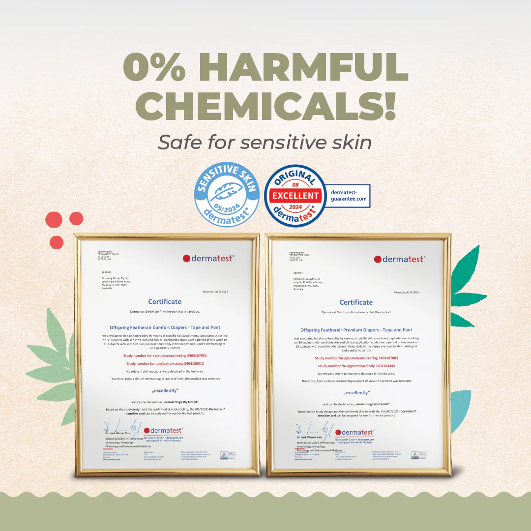 Mindfully made using sustainably sourced materials, our diapers are dermatologically tested and free from chlorine, fragrances, dyes, latex, lotions, optical brighteners and other harmful chemicals — ensuring pure, gentle care for even the most delicate skin.