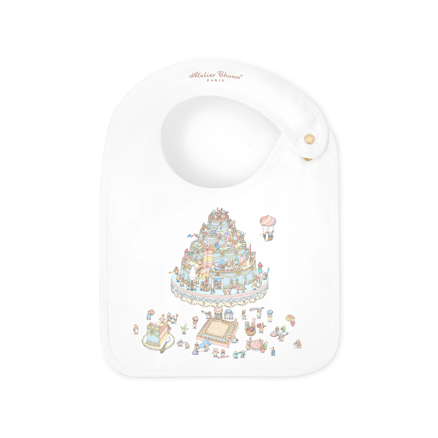Reversible and adorned with original illustrations on both sides, the Atelier Choux bib blends practicality with artistic charm. The bib is adjustable and features branded golden snaps. Recommended from birth to 24 months.