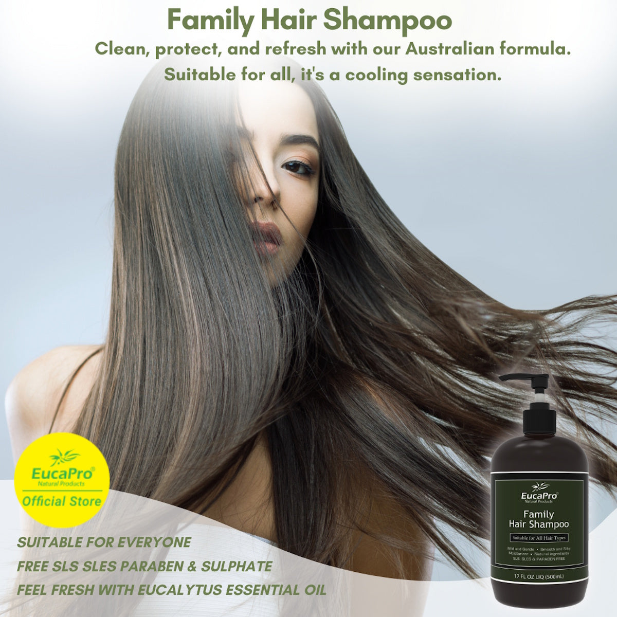 Directions: Pump a small amount of Eucapro family Hair Shampoo to wet hair and scalp, massage into a rich lather. Then rinse off thoroughly.