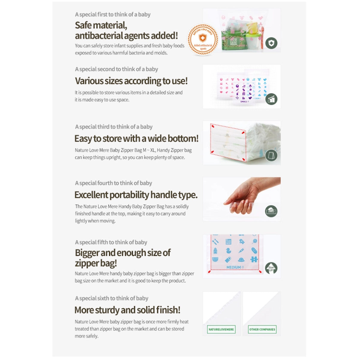 Each size is designed for specific storage needs, from snacks to diapers, clothing, feeding items, travel essentials, and more. With temperature resistance from 100℃ to -40℃, these bags are reliable for everyday use.