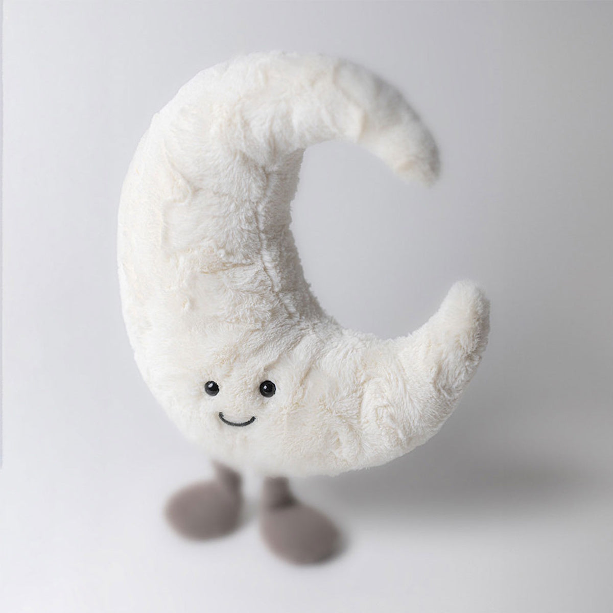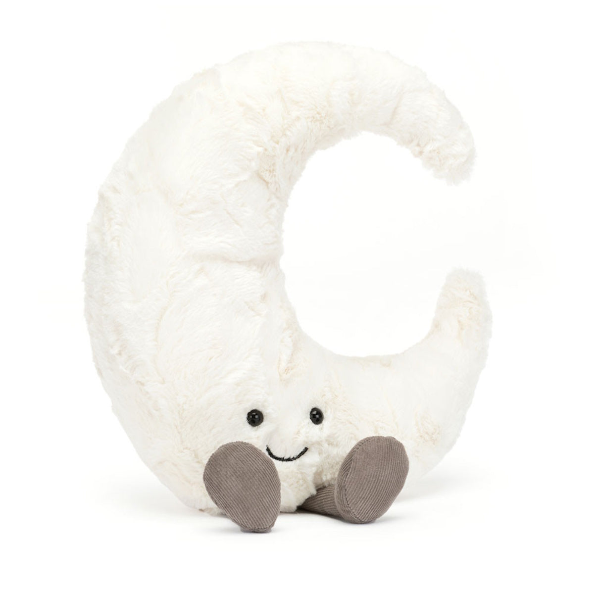 Gorgeously textured with velvety craters, Amuseables Moon is full of fun! A midnight matey for bedtime hugs, this pearly-white pal is curvy and cuddly. With squidgy cord booties, a weighted bottom and a peaceful smile, this moon's waxing poetic! A magical crescent and a marvellous present.