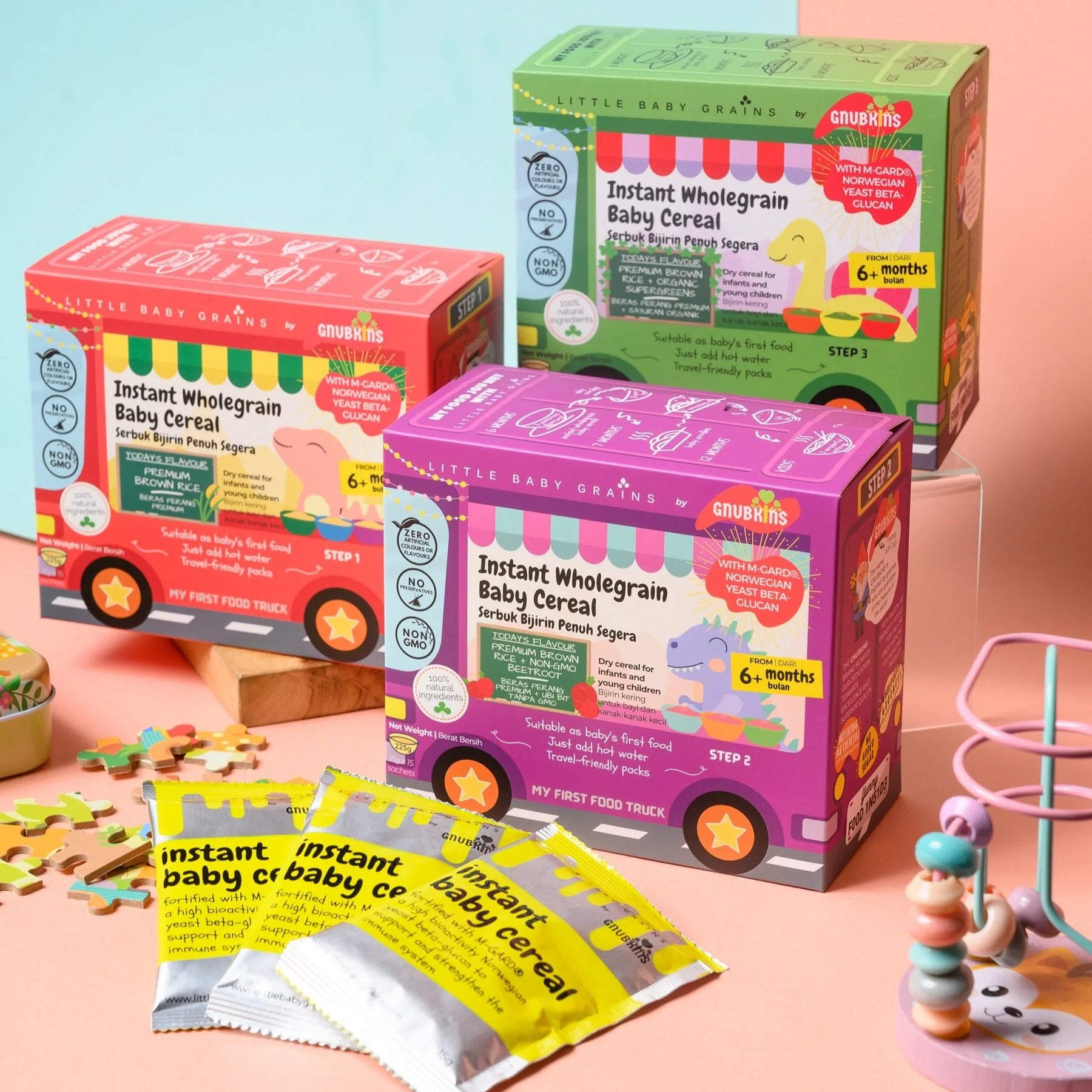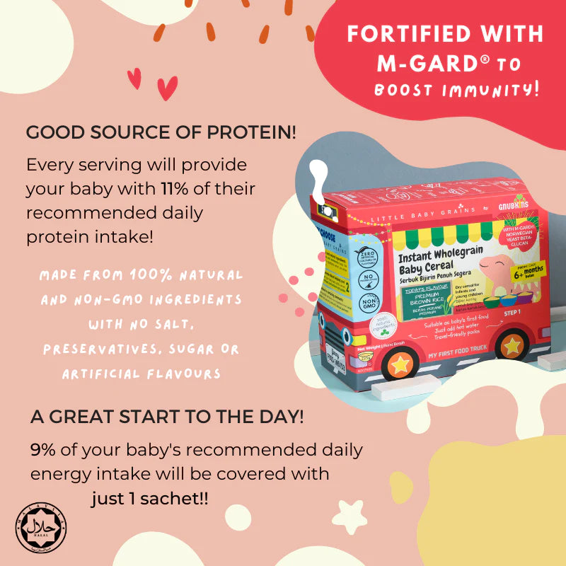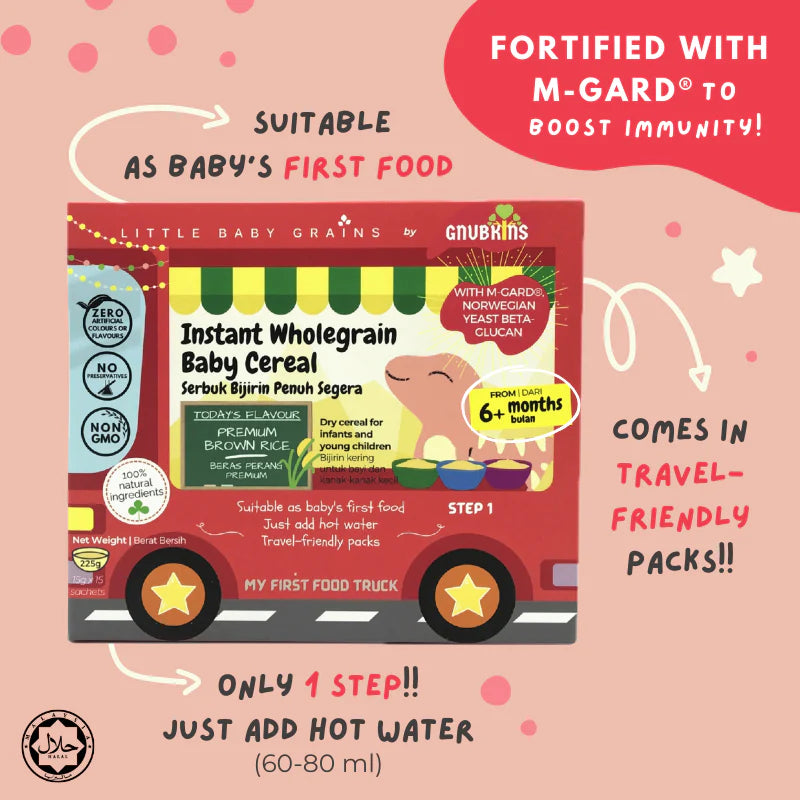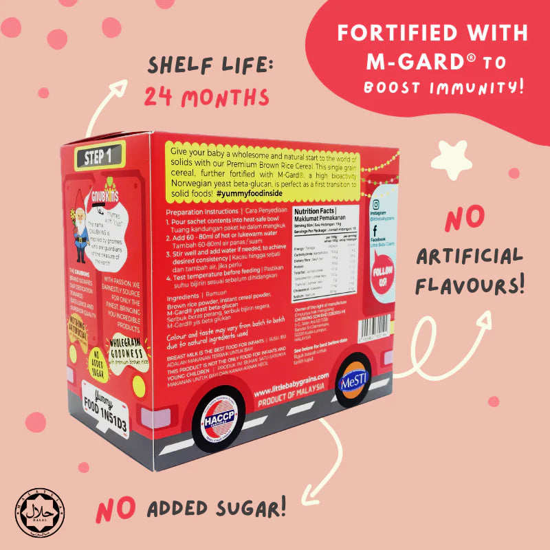Perfect as a first transition to solid foods for babies at 6 months! This cereal is made from specially selected premium brown rice, free from nasty toxins and heavy metals like arsenic, mercury and lead. All ingredients are 100% natural with NO salt, preservatives, sugar or artificial flavours. Specially formulated and fortified with M-Gard®, a Norwegian yeast beta-glucan, with a unique molecular structure, increasing its effectiveness!