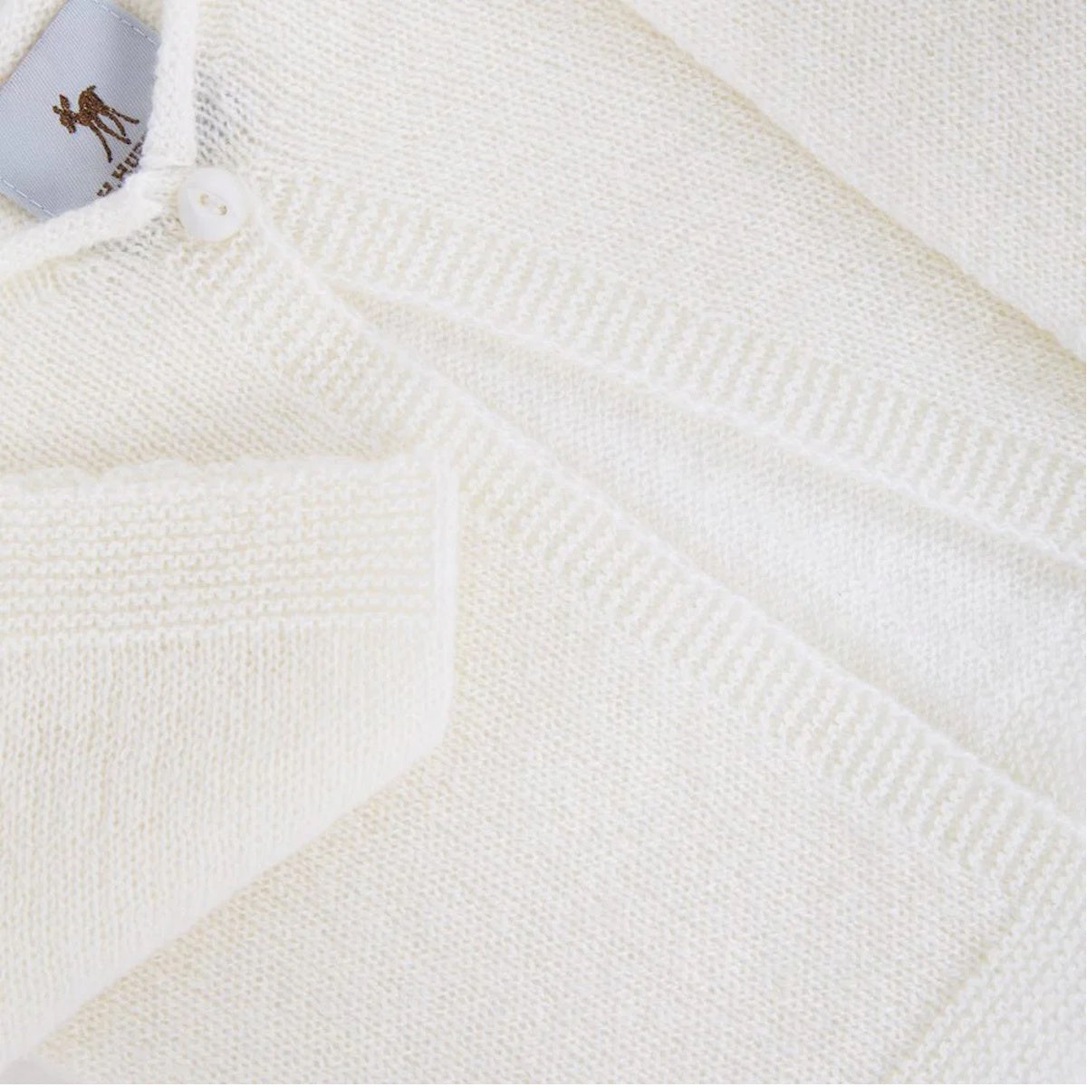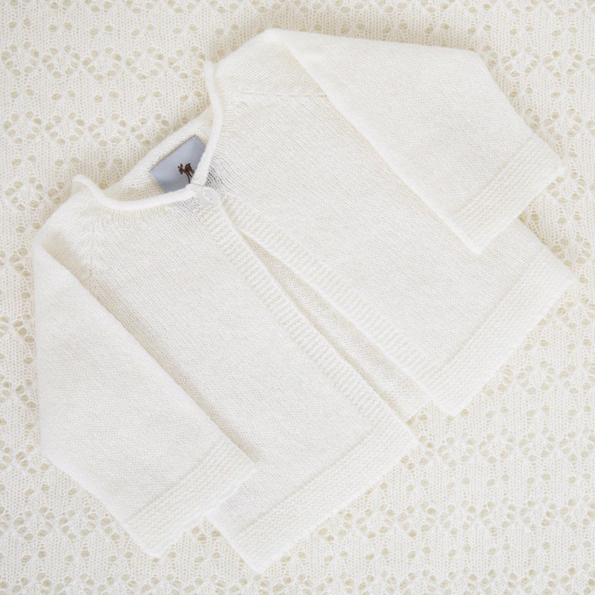 This adorable White Baby Cardigan, will keep baby warm and cosy with the gentle touch of 100% cashmere next to baby's soft skin. Beautifully made and hand finished in our historic shawl factory in Nottingham, England.