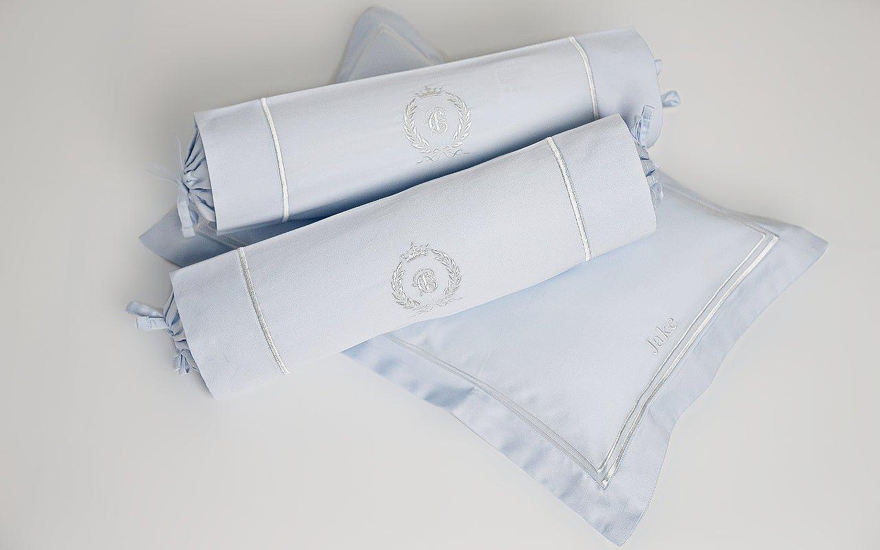 Indulge your bundle of joy with our lustrous pure Egyptian Cotton pillow and bolster. Our soft and fluffy pillow and bolster, enveloped in silky smooth Egyptian Cotton facilitates airflow and prevent overheating which can help your little one sleep comfortably for longer hours, all this whilst keeping them warm and snugly. Meticulously woven and gracefully enhanced by two rows of embroidery in pearl white, this piece of bedding will surely keep your loved ones comfortably in bed.
