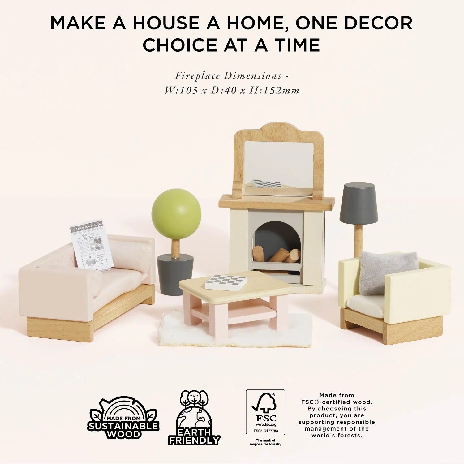 Sit back and relax with this stylish miniature sitting room, just the ticket to bring the wow factor to any child’s dream dolls house set up. Complete with 19 individual accessories, each piece is solid, sturdy and sustainable, crafted from FSC®-certified wood and built to last for generations of play.