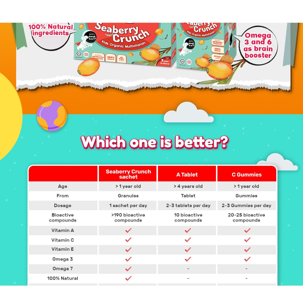 Seaberry Crunch is made of 100% organic seaberry and honey. It contains Vitamin A, B3, C, E, Omega 3, 6, 7, 9, and other bioactive compounds, which are known to help strengthen the kids’ immunity, digestive function, and brain health. The freeze-dried seaberry granules offer great taste and crunchy texture, making the consumption experience more exciting! Try it out now!