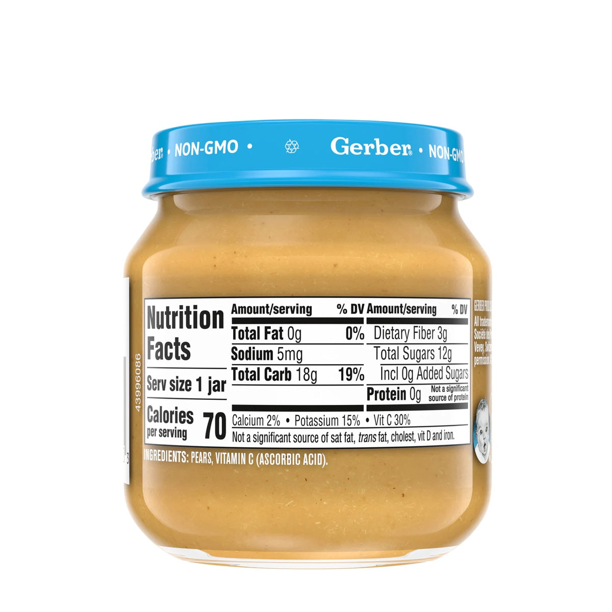 Start your baby’s love of fruits early with Gerber 1st Foods Natural Pear Baby Food. Made with all natural fruit, this Gerber pear puree with vitamin C contains 2-1/2 servings of fruit per jar. The pears that go into Gerber purees are grown using Clean Field Farming practices to ensure they're nutritious, wholesome and safe for every tiny tummy. Made with non-GMO ingredients, this Gerber baby food stage 1 recipe contains no artificial flavors, colors, sweetener or added starch. The texture is just right for introducing solids to your little one, and single-variety fruits or veggies are ideal for introducing new tastes and checking for sensitivities. Glass jars keep this baby food fresh and offer convenient storage and portability. Feed your baby right from the jar, or spoon some into a dish and refrigerate the leftovers for up to 2 days.