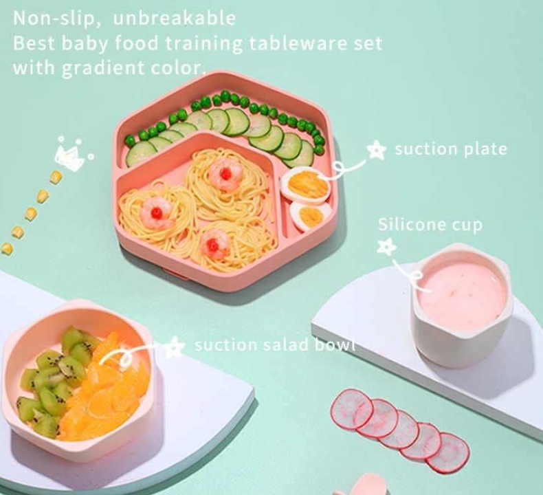It would be a super addition to the high chairs when your little ones are having food on their own. Well thought design of suction base with less turning over mess. HEORSHE plates uniquely in a honeycomb shape with hexagon edge. These natural silicone are easy to clean and each set with various color combination catching babies eyes. Â When you have a baby growing up to eat by themself, a set of attentive tableware is a great help, this should be your best choice.