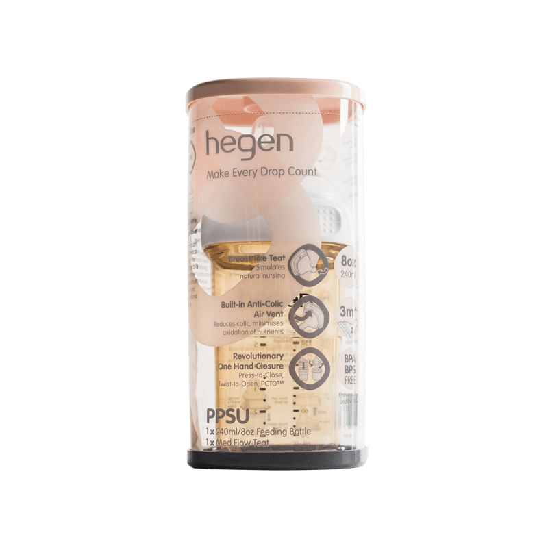 Hegen PPSU range is made of FDA compliant food-contact grade and NSF certified medical grade material. PPSU is widely used in the manufacturing of medical appliances due to its superior toughness and high temperature resistance. It combines the advantages of both glass and plastic materials ; BPA-free and lightweight. PPSU is naturally amber-coloured and contains no artificial pigments. Simply swap adapters, feeding collar and storage lids to express, store and feed in a single container with no wasteful transfer of milk, making every drop count! A Hegen is both aesthetically pleasing and inherently functional!