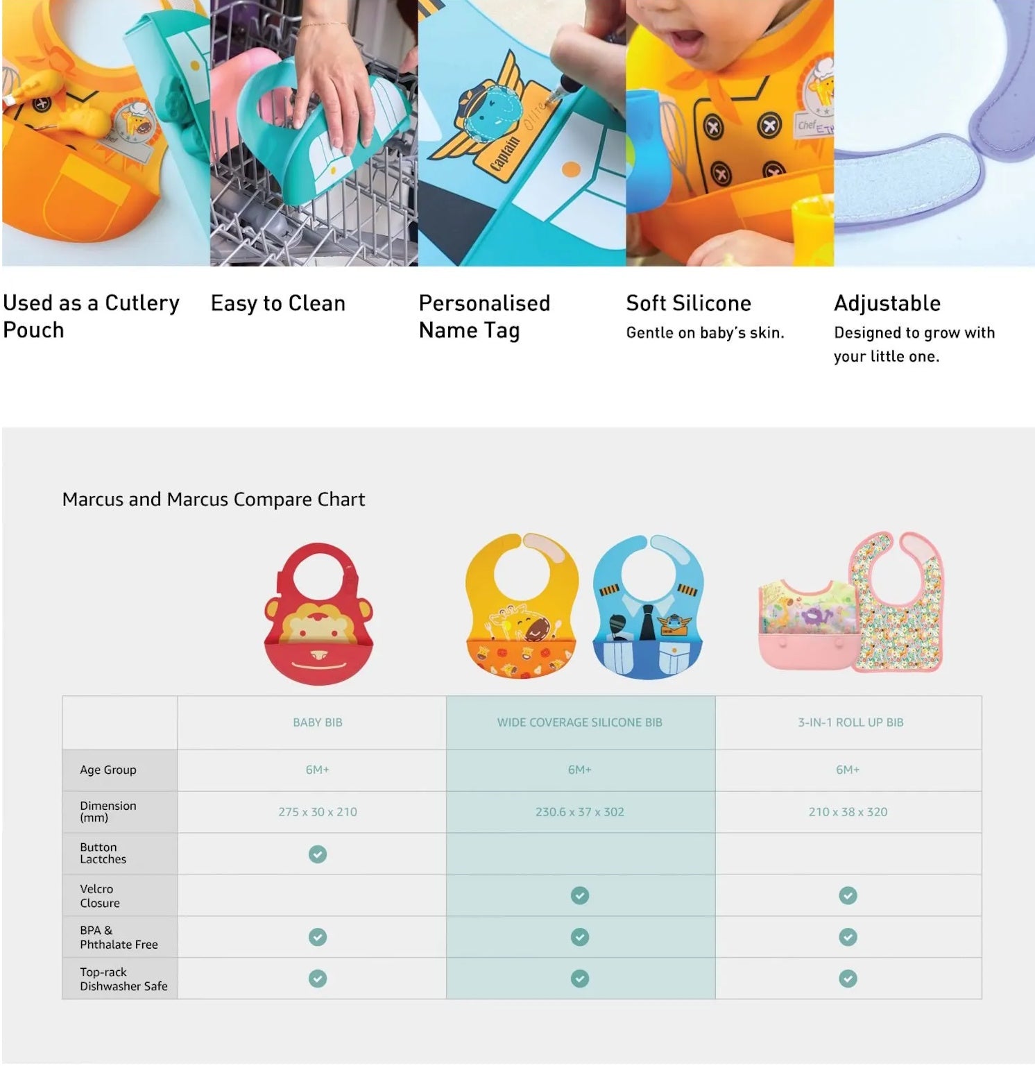 Marcus & Marcus Creative Play Wide Coverage Bib comes with 2 themes – The Little Chef and The Little Pilot.