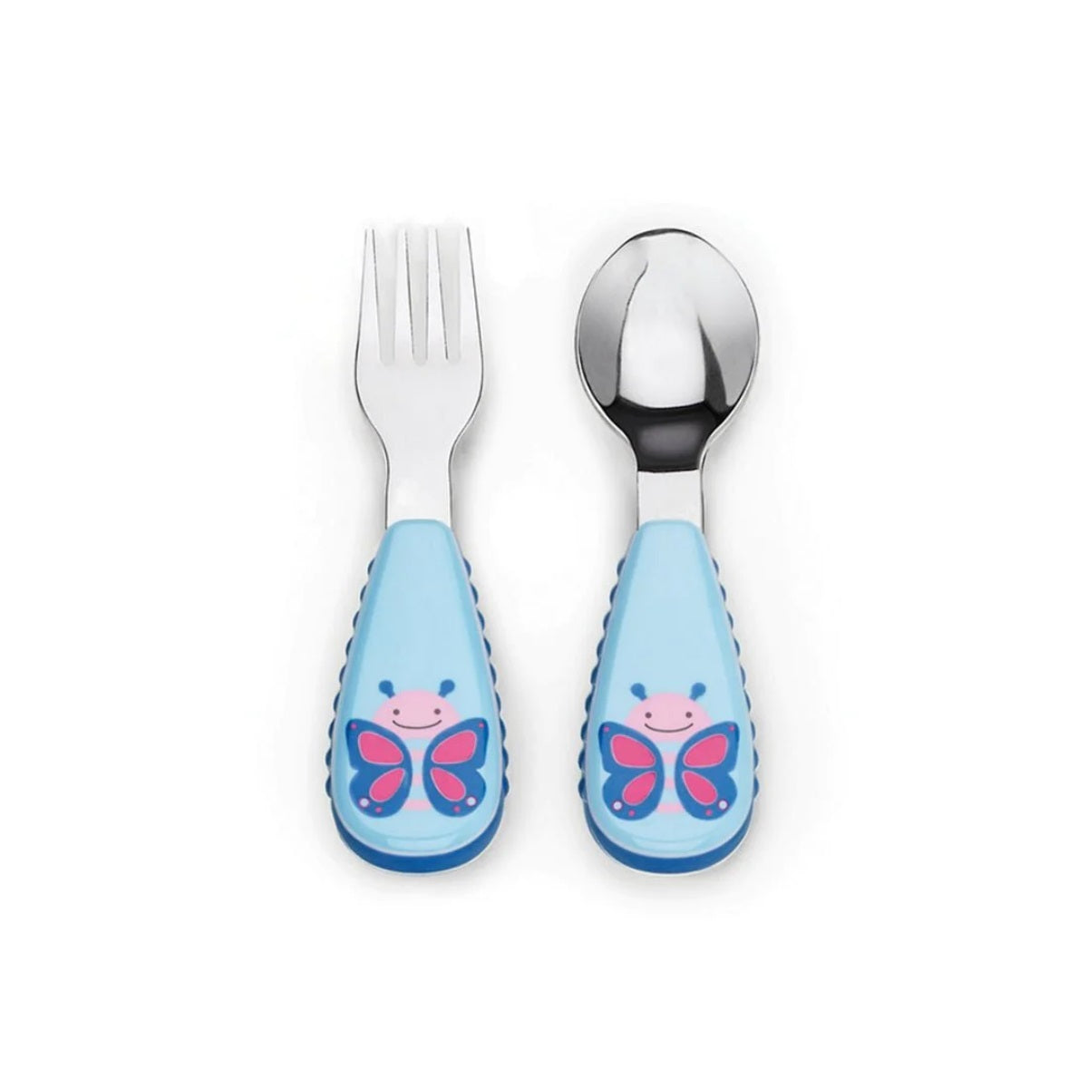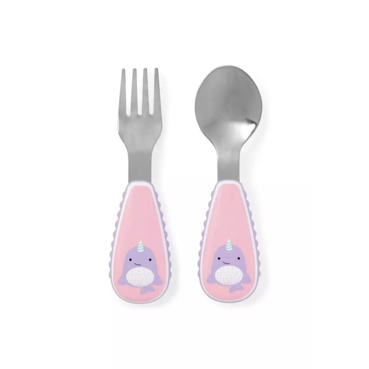 This adorable fork & spoon has soft side grips so it's easy for little ones to hold. Stainless steel heads make the utensils feel very grown up for little ones!
