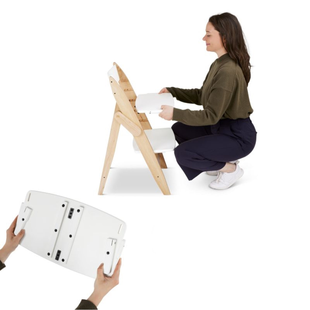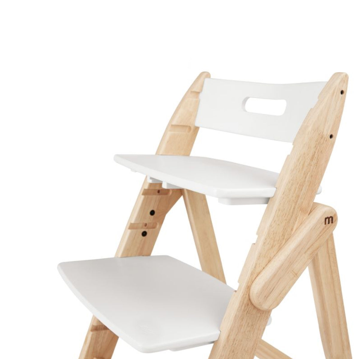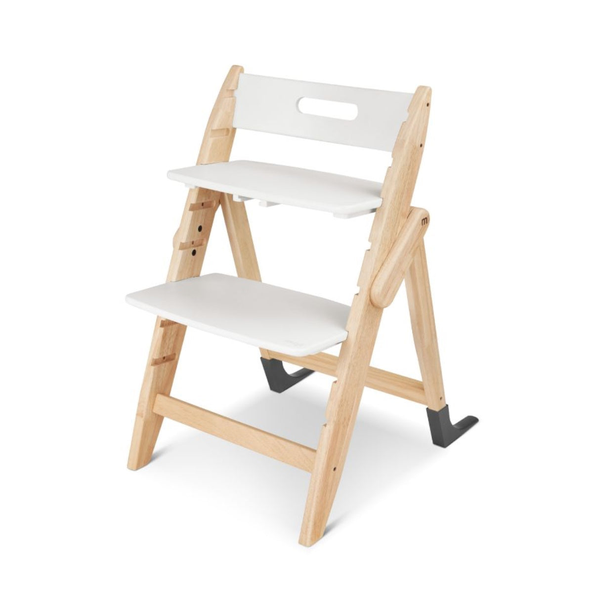 The Yippy highchair can be adapted to your child's needs in no time at all. It is quick and easy to assemble and ready to use immediately without any tools. The simple click system allows you to change the position of the seat and footboards within a blink of an eye. It only takes two simple steps to attach them at the desired height and adjust them to the size of your child.