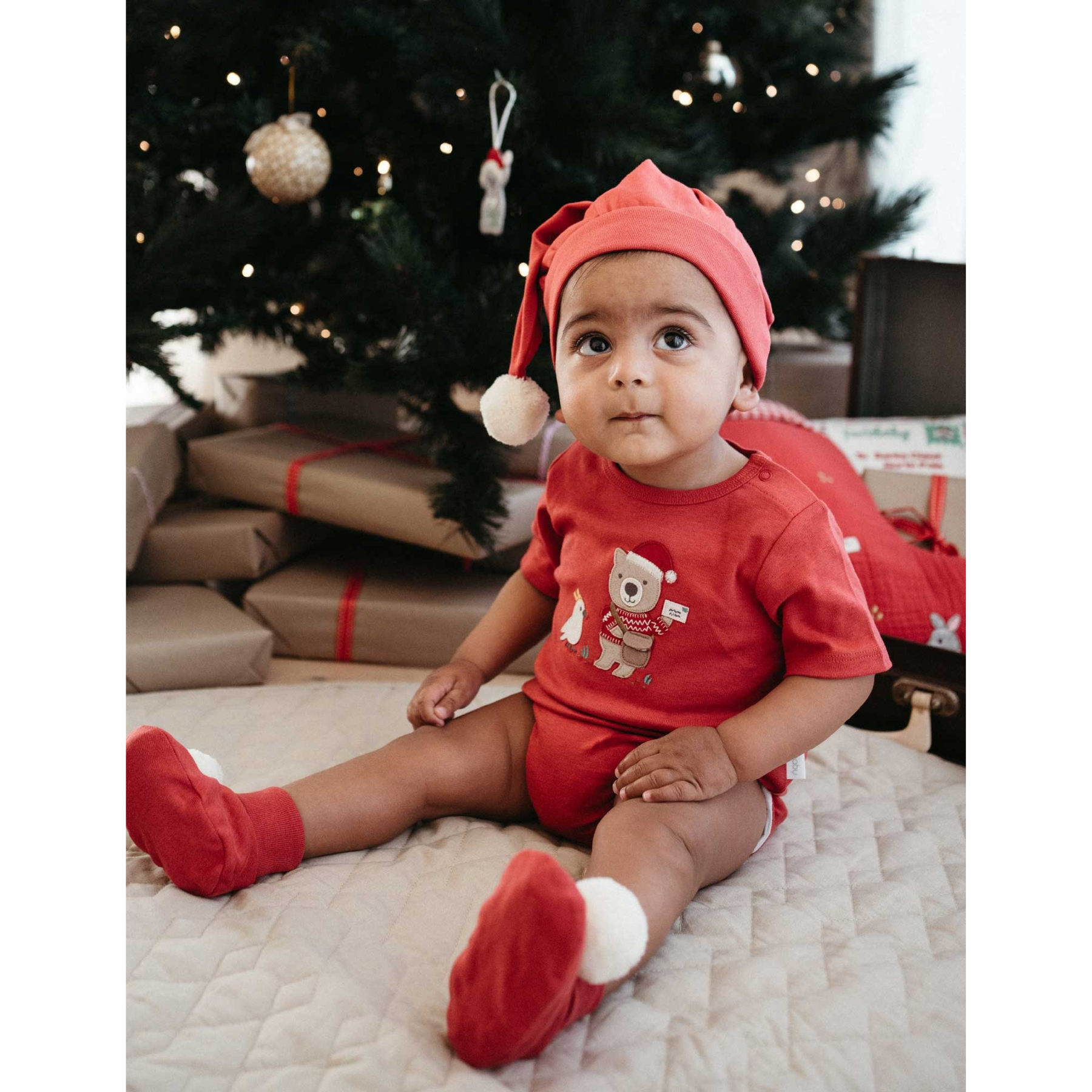 Featuring an adorable Postie Santa print in a classic Christmas red colourway, this bodysuit adds playful holiday charm while keeping little ones cosy. Designed with practicality in mind, the snap-button closure allows for easy dressing and quick nappy changes.