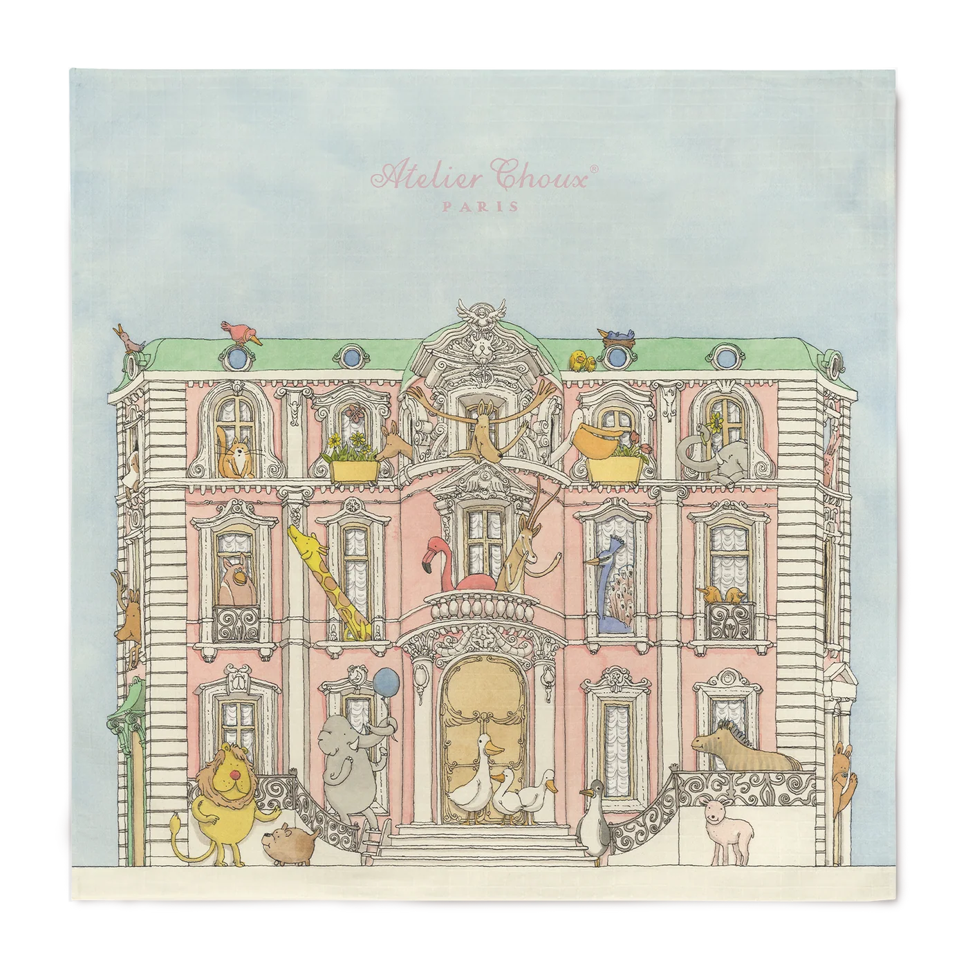 Each design features whimsical illustrations by Mattias Adolfsson, a Swedish artist known for his intricate, imaginative style. Featuring the charming facades of townhouses bordering the Parc Monceau in Paris adorned with playful animals, this Grand Carré offers a gentle embrace for your little one.