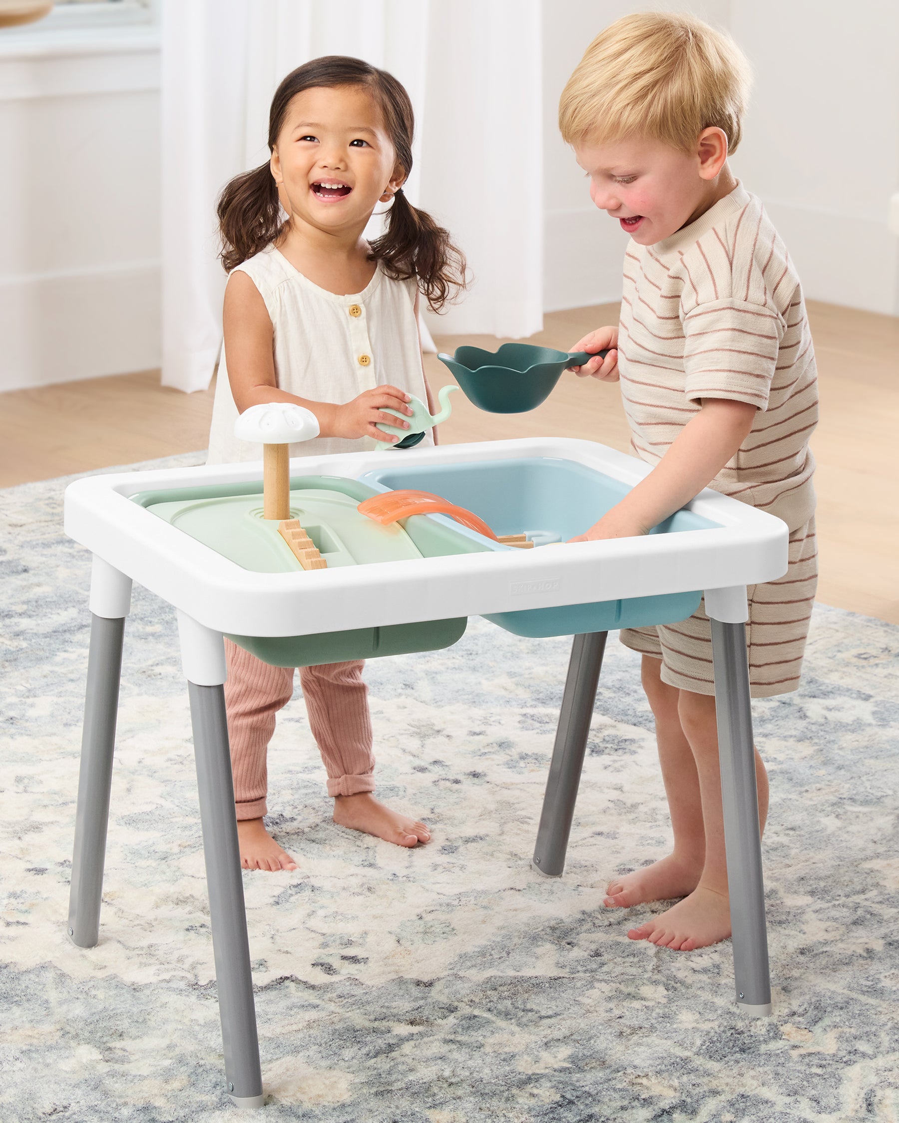 Developed in collaboration with a sensory play expert, our 24-piece sensory table for toddlers set offers limitless ways to explore, learn, create and play. Designed to grow with your child, early sensory exploration begins with floor play and the included tools (wooden tongs & rollers, animal scoops, shovel rake & more)—they can be used in so many ways! As your little one grows, add the legs to the sensory table and experiment with fillers such as sand, dry pasta, water, sculpting clay and more found objects. Dig, sort, sculpt, scoop, pour & more—stretch your imagination and create a hands-on landscape for sensory play for toddlers. Need inspiration? The included activity guide has lots of sensory play ideas to try using our sensory bin table and your own sensory fillers for years of learning & fun.
