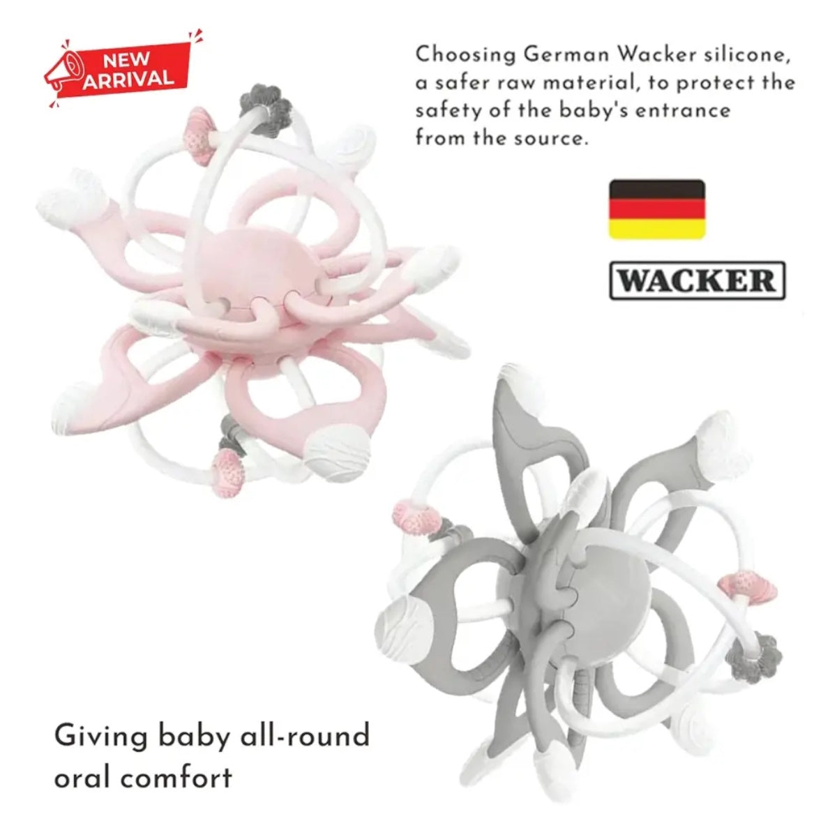The silicone cross ring designed for baby teething toys is easy to grip. Each silicone ring has passed strict tensile test, no risk of parts falling off, no choking hazard.