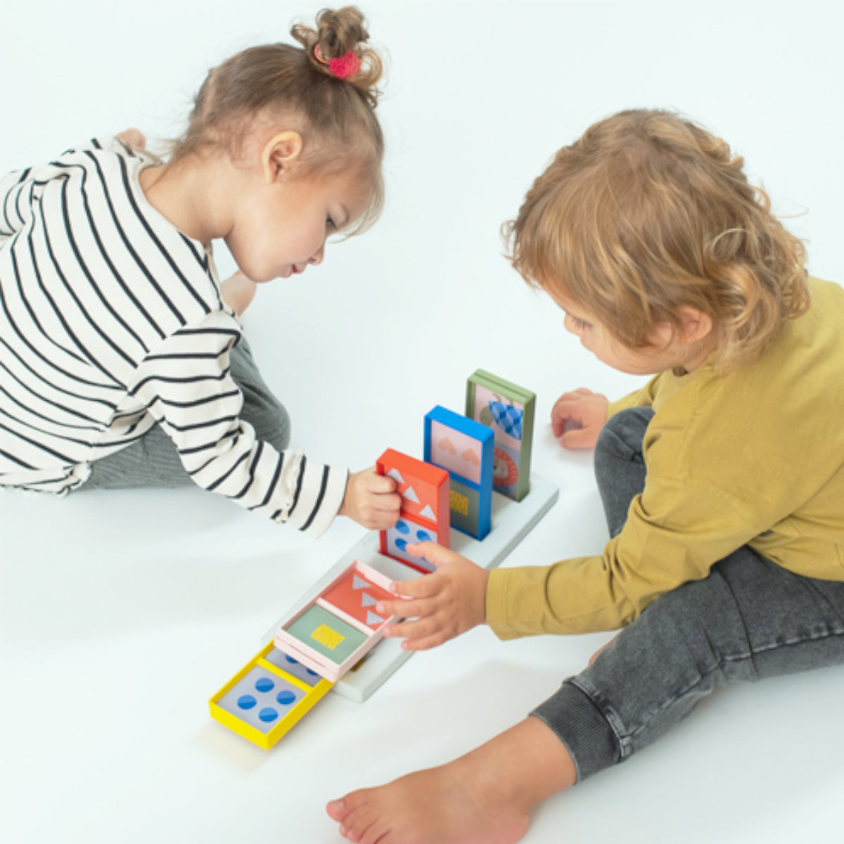 - 24M+ Rally place by color - Matching domino’s color to the same color of the rail’s slot supports cognitive development by color recognition and matching skills.