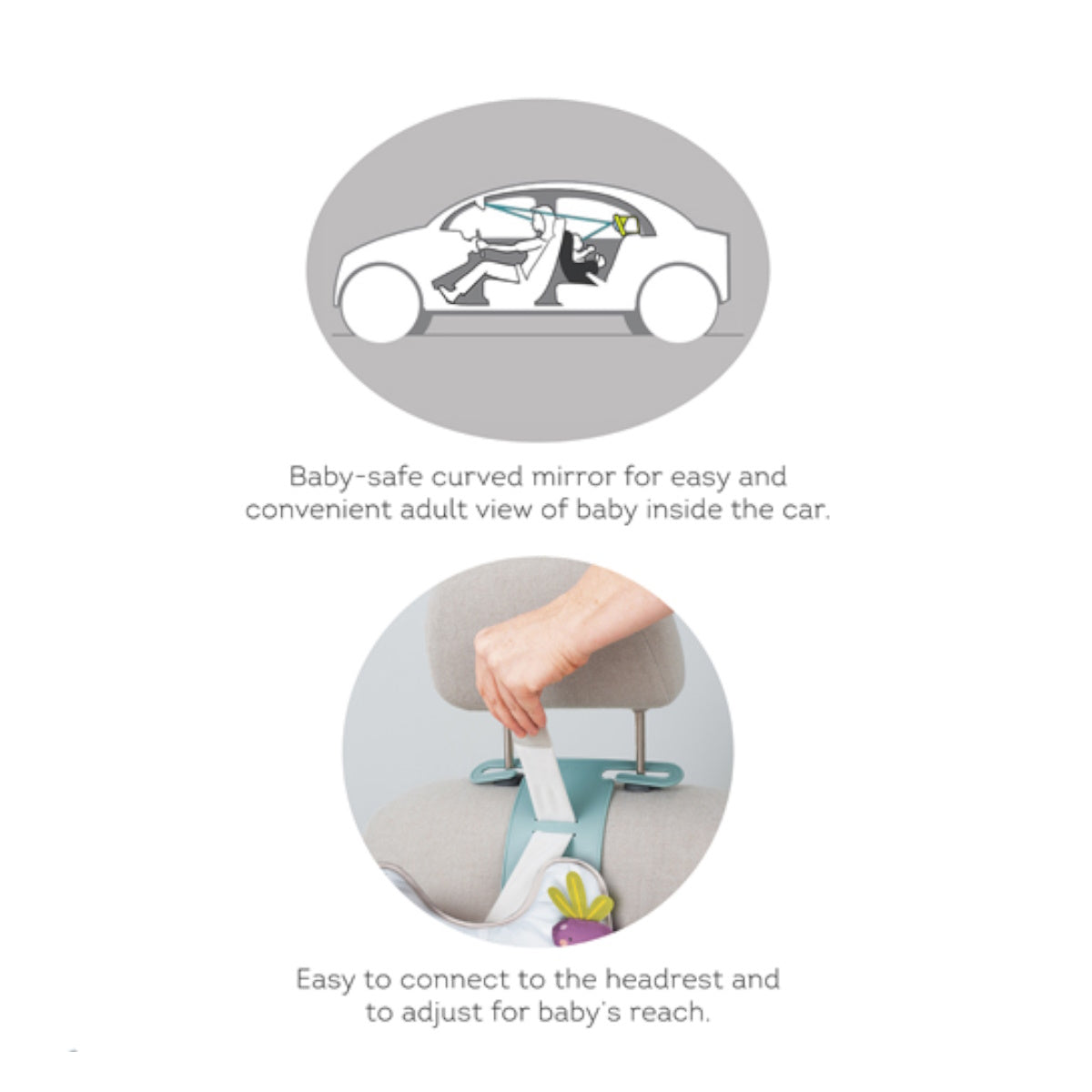 - An innovative travel activity center that includes high quality rear view mirror for easy and convenient adult view of baby inside the car and a colorful travel toy to entertain babies traveling in a rear facing car seat
