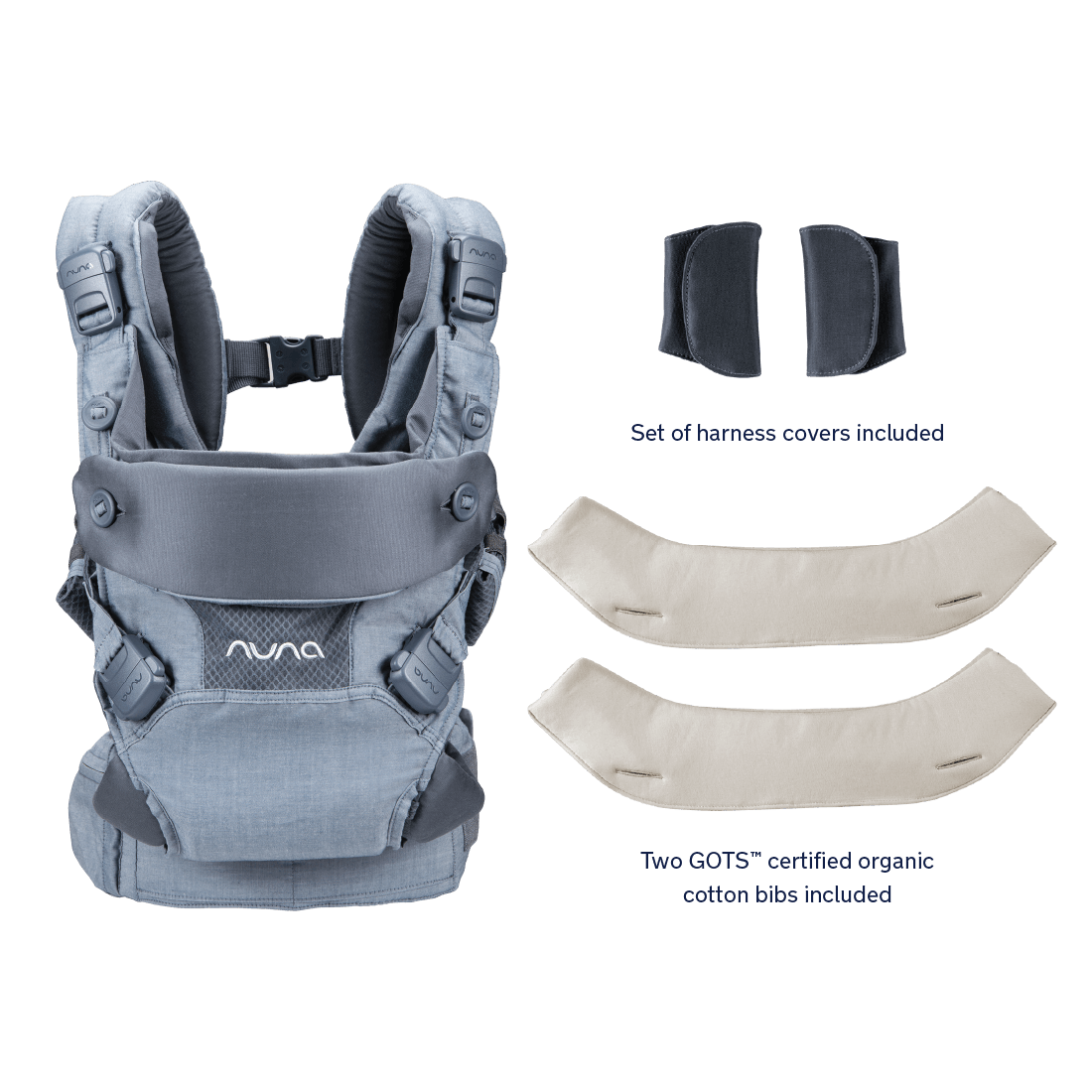 - GOTS™ certified organic cotton bibs included (set of 2)