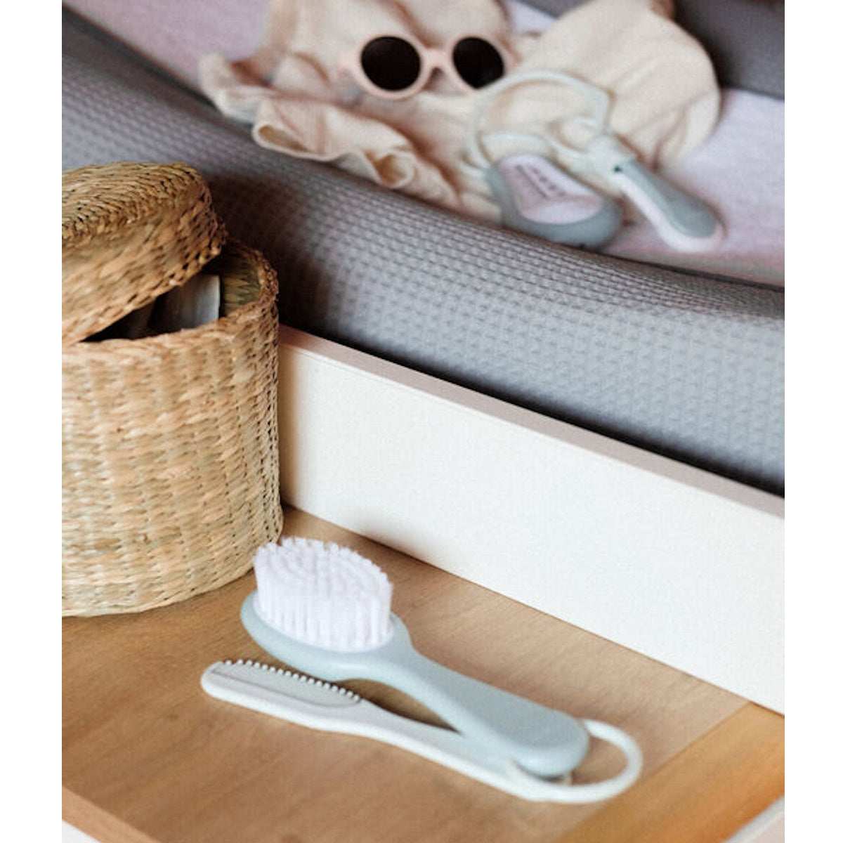 Consisting of a bath thermometer, nail clippers and comb-brush. Every element of this set has been carefully selected to meet your baby's essential needs. Practical and clever, all accessories are hung on a ring with carabiner, which makes them easy to use and store. No more misplaced objects and stressful moments; Everything is at your fingertips to take care of your baby with ease.
