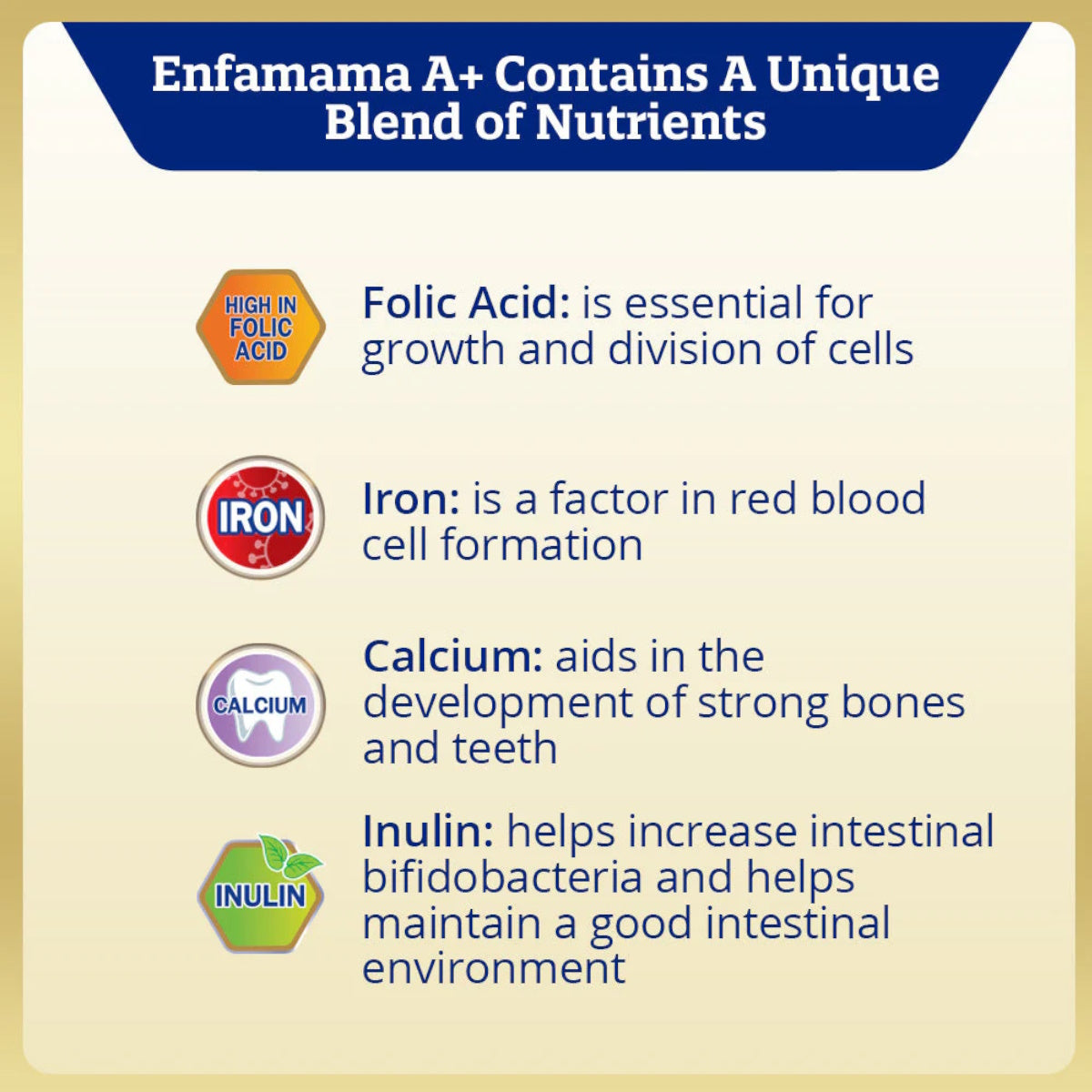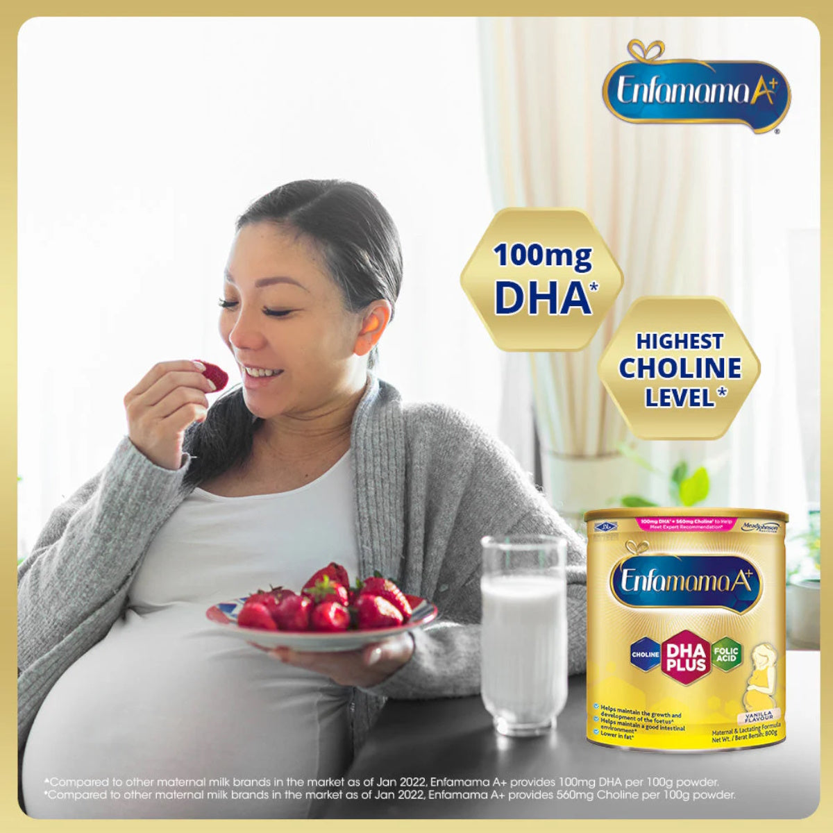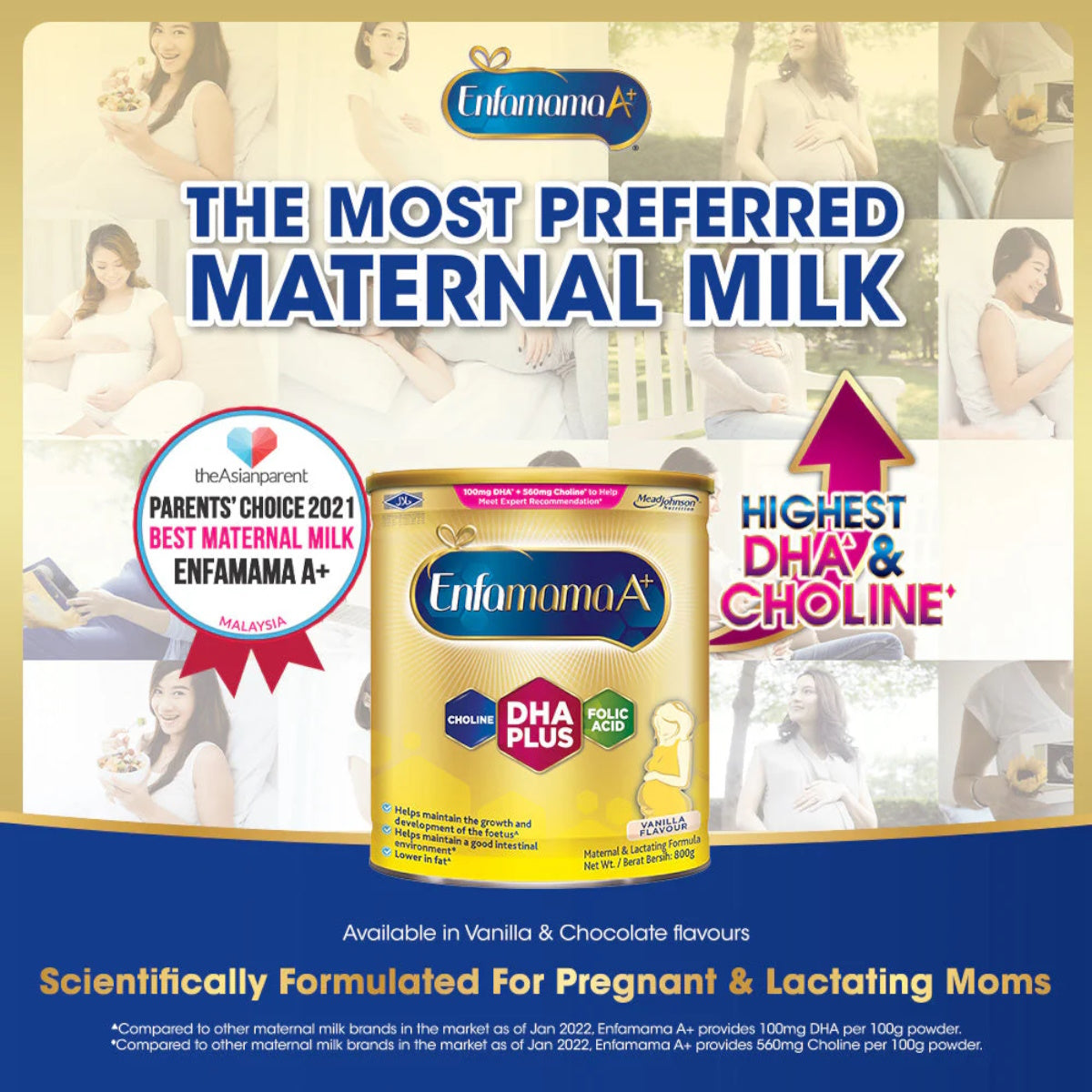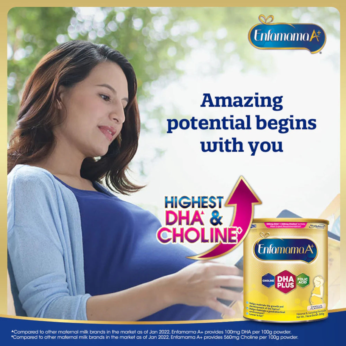 Enfamama A+ is scientifically formulated for pregnant and lactating moms. Enfamama A+ is the ONLY brand with highest DHA & Choline to support developing baby’s brain development while supporting maternal nutritional needs for nutrients such as folic acid, protein & calcium.