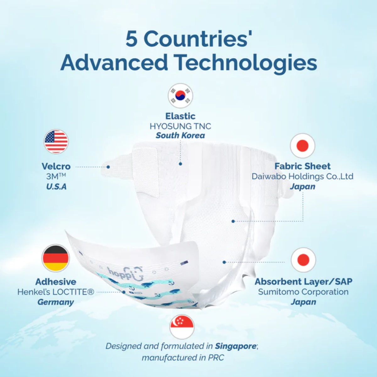 Hoppi AirDream Diapers are fluff-free, chlorine-free and are the thinnest diapers in the market! Made up of a highly compressed 7-layer structure, our 2mm UltraCore™ Technology takes absorption to a whole new level. With two layers of Super Absorbent Polymer (SAP), it distributes liquids effectively and locks it in for up to 12 hours!