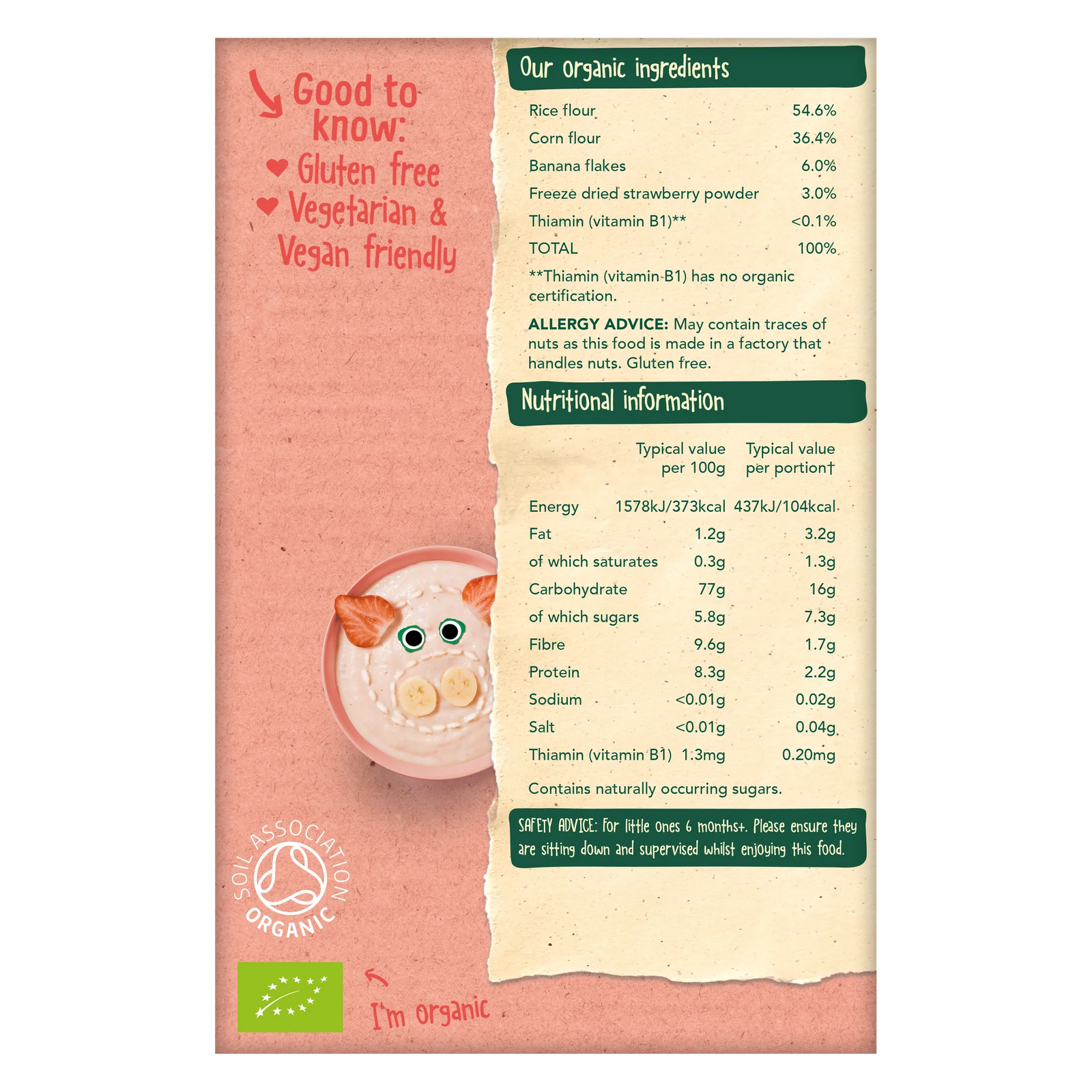 Our organic strawberry and banana rice porridge for babies is made with real fruit. The delicious flavour comes from the strawberry and banana, with no added sugar, artificial flavours or sweeteners, and that's a promise!