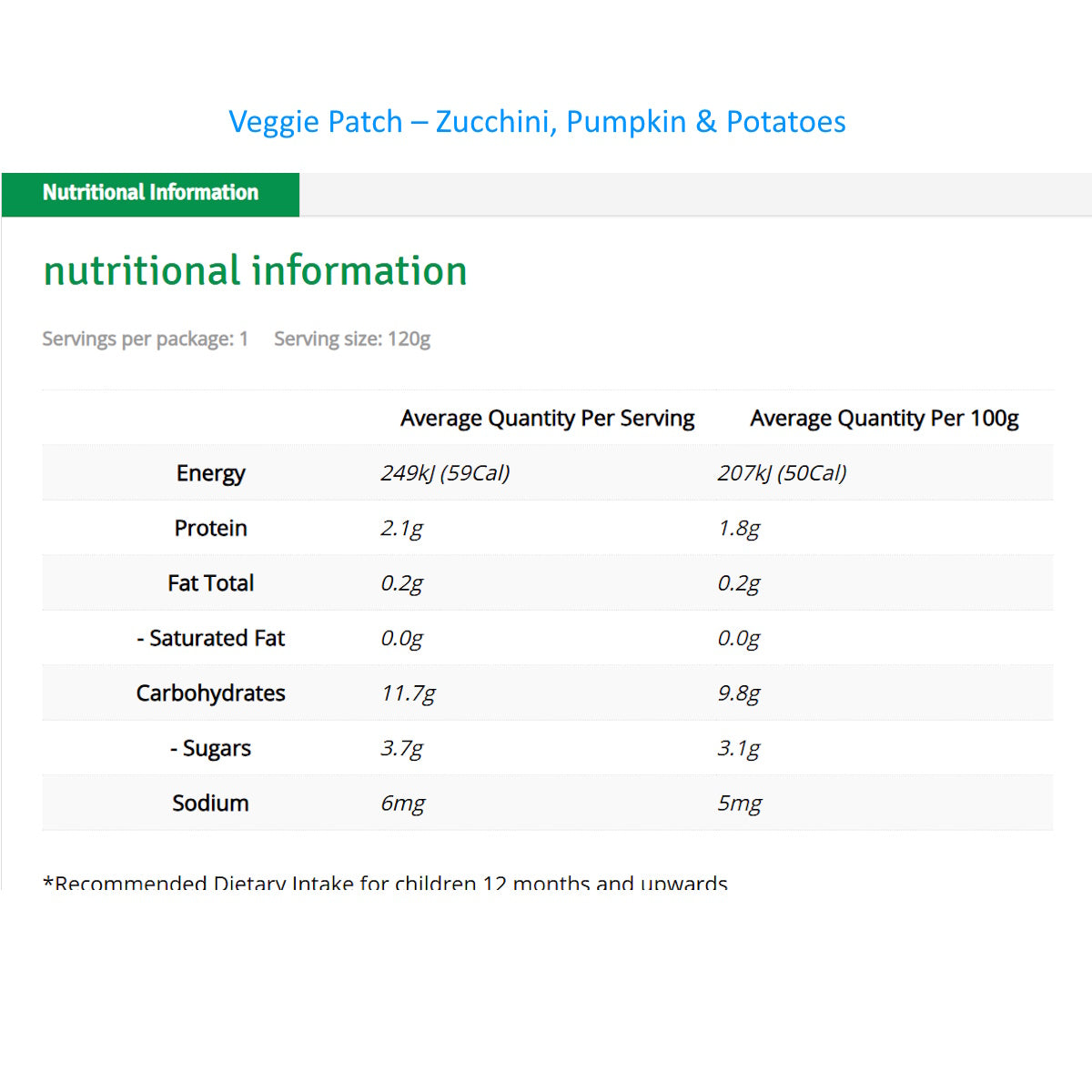 Ingredients*: Water, Sweet Potato (33%), Carrot (13%), Sweetcorn (12%), Spinach (1%)