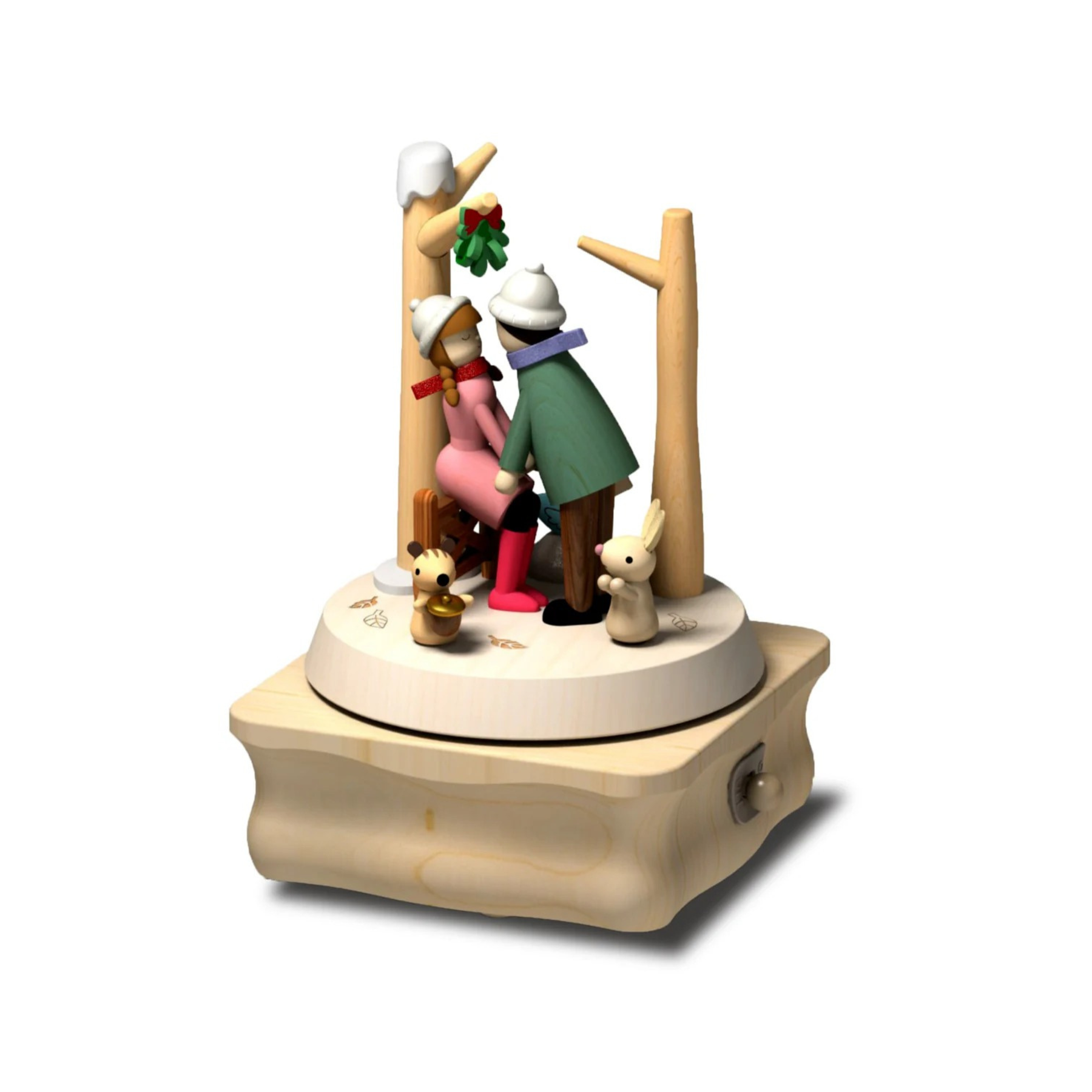 Celebrate love and holiday charm with the Kiss Under Mistletoe music box by Wooderful Life. This beautifully handcrafted piece captures a sweet winter moment between two characters sharing a kiss beneath the mistletoe, brought to life with gentle motion and a warm, festive melody.